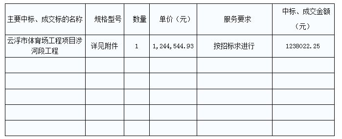 云浮市億鑫招標采購代理有限公司受云浮市體育局的委托,于2019年01月30日就云浮市體育場工程項目涉河段工程(445300-201901-408001-0002)采用競爭性磋商進行采購。現(xiàn)就本次采購的中標(成交)結果公告如下: